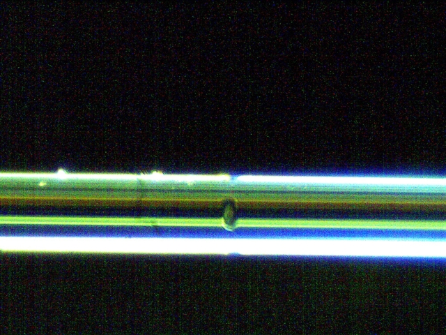 Micromachining of holes into the core of a conventional fiber is attempted to hold a fluorescing substance to be analyzed. As optical fibers are easy to connect to standard equipment for quick spectroscopy sensing, they are used as a platform. Figure 5, summarizes the idea. A small conical hole of about 40 µm in diameter is drilled by laser into the core of a conventional SMF 28 of 125 µm. Then a liquid to be diagnosed can be inserted into the micro-machined hole. Light can be launched at one end (left end in figure 5) and then it becomes possible to detect the fluorescence at the other end (right end).